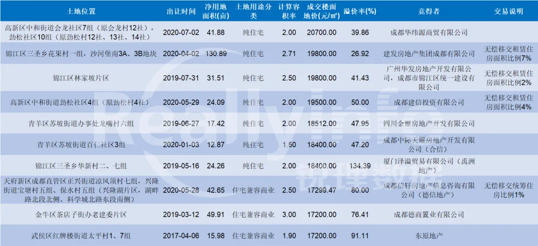 (成都成交楼面地价TOP10)