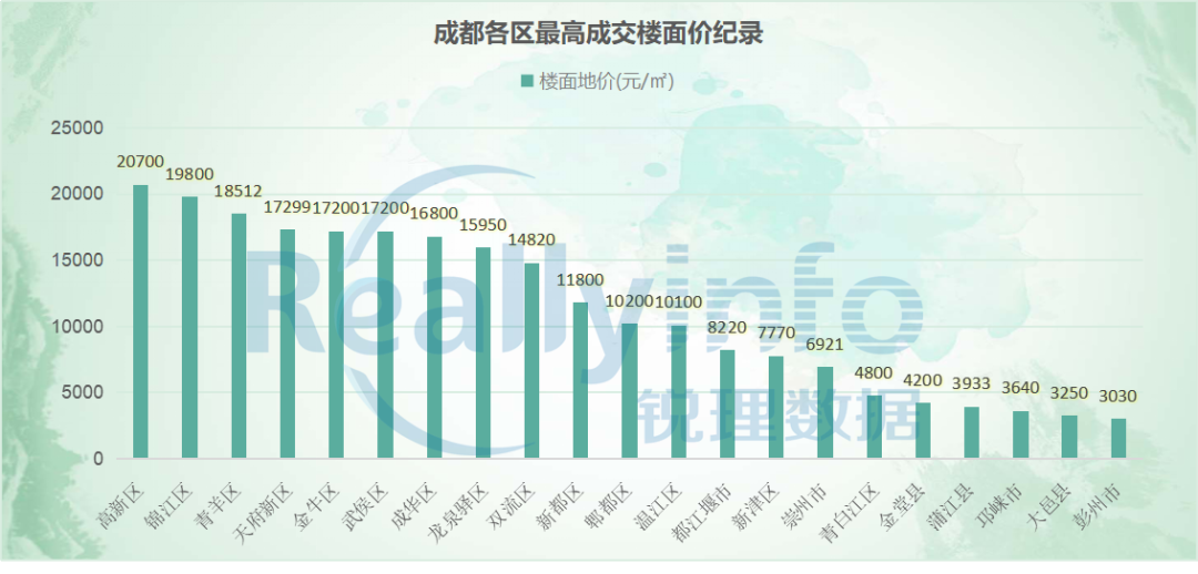 截至目前,2020年成都21区市县中,高新区、锦江区(加上7%的移交比例)、成华区、天府新区、新都区、龙泉驿区等多区最高成交楼面地价更新。